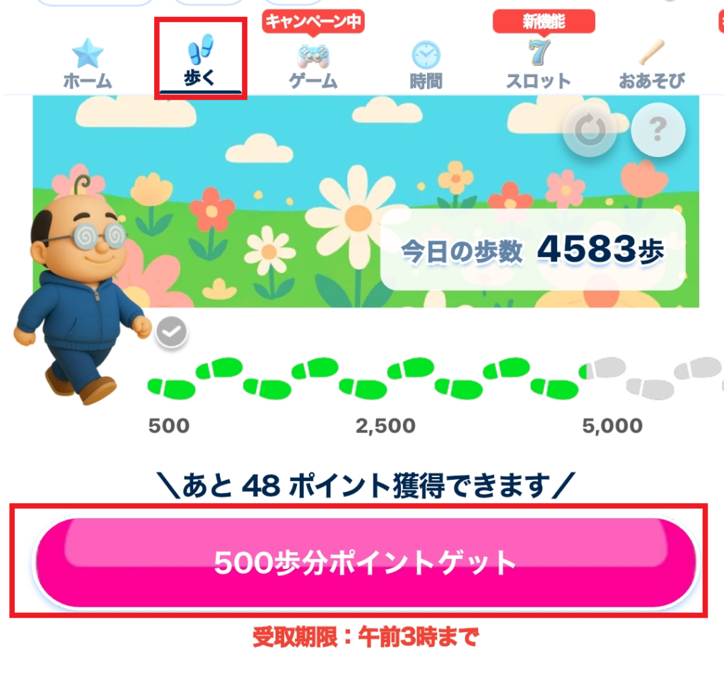 - 「ためる」 > 「歩く」タブで500歩ごとにポイント獲得