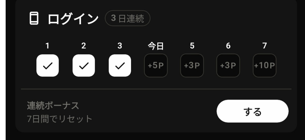 - 1日目で60pt、連続2日目以降はボーナスがつく