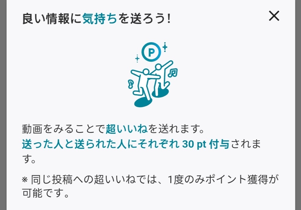 - 投稿に対して、広告を見て「超いいね」をすると、お互いに30pt獲得