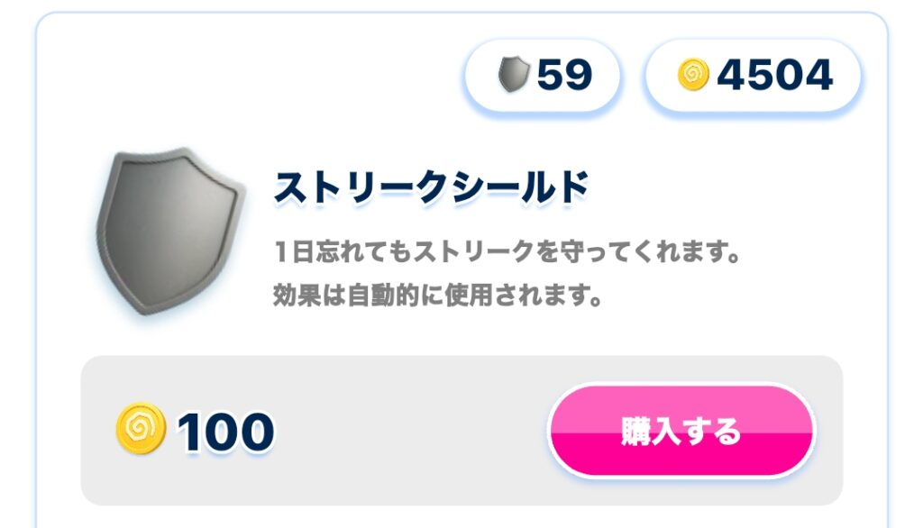 • ストリークシールドを持っていると、ポイントを獲得していない日があっても、連続取得日数がリセットされずに維持される