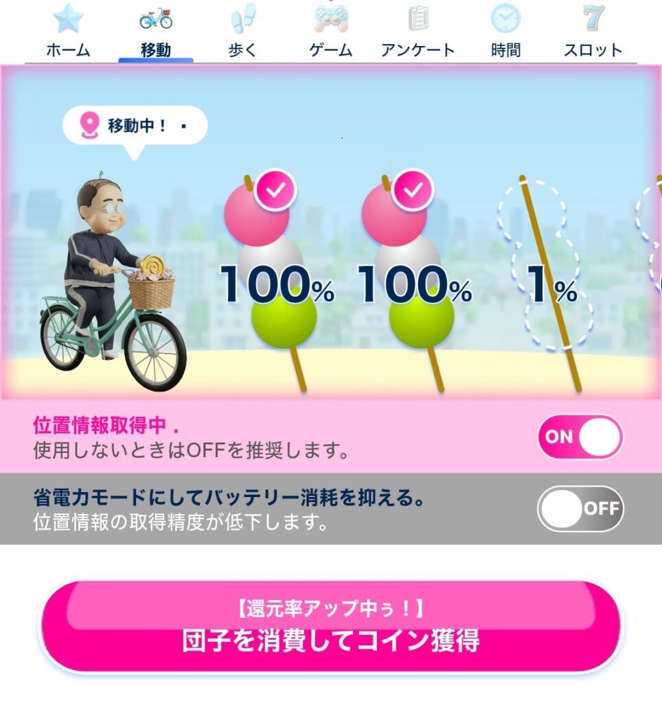 基本は歩数と移動距離でポイントを獲得し、ログインボーナスミニゲームでもコツコツ加算。