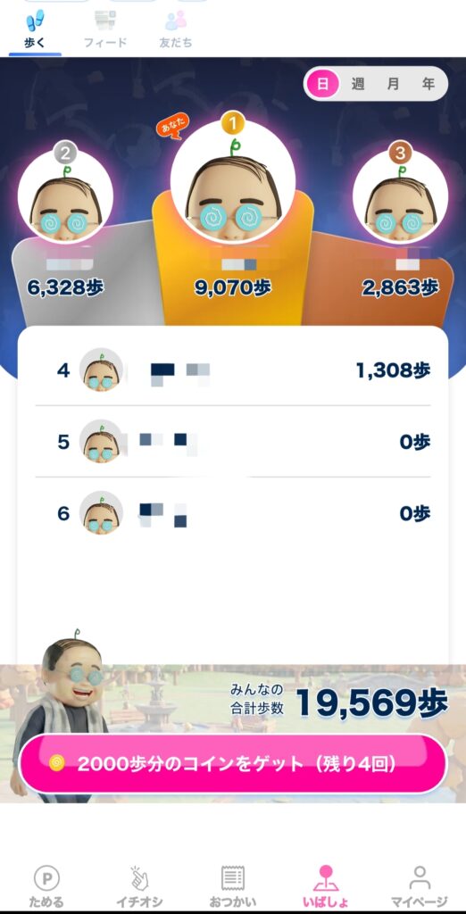 各ユーザーの歩数が合計され、2000歩ごとに5pt獲得できます。