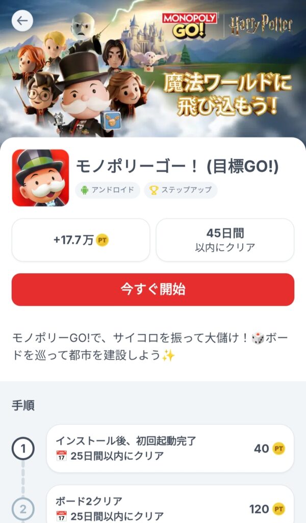 ② 1つのゲームをコツコツ進める「アプリ利用でptゲット」&「マルチステージアプリ」