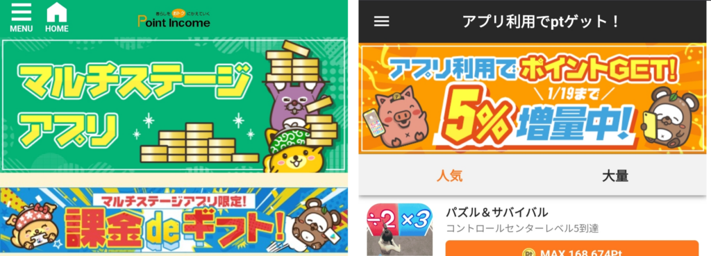 左:マルチステージアプリページ/右:アプリ利用でptゲットページ